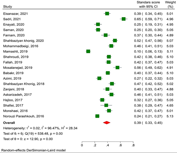 نتایج نشان داد که نمره استاندارد ترکیبی برای اعتیاد به گوشی هوشمند 39 % (با فاصله اطمینان 95%: 45-33 درصد) (شکل2) است. نتایج تحلیل زیرگروه به تفکیک نوع جامعه هدف نشان داد که نمره استاندارد اعتیاد به گوشی هوشمند در دانشجویان 5/39 درصد (با فاصله اطمینان 95%: 5/46-6/32) و در دانش‌آموزان 6/36 درصد (با فاصله اطمینان 95%: 6/48-6/24) بود. دو گروه از نظر نمره استاندارد با هم تفاوت معنی‌داری نداشتند (677/0p=). همچنین، تحلیل زیرگروهی به تفکیک نوع ابزار جمع‌آوری داده‌ها نشان داد که نمره استاندارد اعتیاد به گوشی هوشمند بر اساس مقیاس‌های COS و Savari به‌ترتیب 8/39 درصد (با فاصله اطمینان 95%: 9/46-7/32) و 8/28 درصد (با فاصله اطمینان 95%: 1/41-5/16) بود. نمره استاندارد اعتیاد به گوشی هوشمند در مقالات با کیفیت بالا 38 درصد (با فاصله اطمینان 95%: 7/46-2/29) و در مقالات با کیفیت متوسط 6/39 درصد (با فاصله اطمینان 95%: 8/44-4/34) بود و نمره استاندارد اعتیاد به گوشی هوشمند در بین این دو گروه مقالات با هم تفاوت معنی داری نداشت (755/0p = ) (جدول 2).