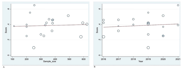 همچنین، یافته‌های متارگرسیون نشان داد که بین نمره استاندارد اعتیاد به گوشی هوشمند با حجم نمونه مطالعات منتخب (834/0p=) و سال انتشار مقالات (648/0p=) ارتباطی وجود نداشت (شکل 3). سوگیری انتشار هم معنی‌دار نبود (211/0p=).