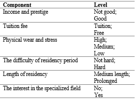 This cross-sectional survey applied discrete choice experiment (DCE) modeling to measure the stated preferences of general dentistry students when choosing dental specialty fields. The questionnaire was prepared according to guidelines for discrete choice studies, which are based on experimental design. An important step for developing a DCE questionnaire is the design of choice sets to present to participants. Therefore, in the first step, components related to students' preferences for choosing a dental specialty were extracted from previous studies, and five targeted qualitative interviews with professors specializing in dentistry at Isfahan University of Medical Sciences. Then, four qualitative interviews with dental residency students at the same university were conducted to identify the most relevant components. At this step, six main selection components and their levels were determined (Table 1).