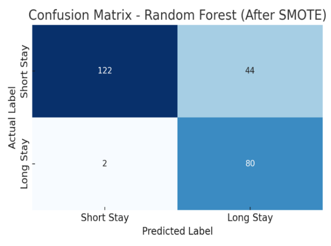 Balancing the data: To balance the binary LOS classes, resampling techniques including over-sampling, under-sampling, and synthetic minority over-sampling technique (SMOTE) were applied. SMOTE achieved the best performance an AUC of 85% and F1-score of 78%, providing more diverse and generalizable synthetic samples. Resampling was performed only during model training for supervised classifiers.