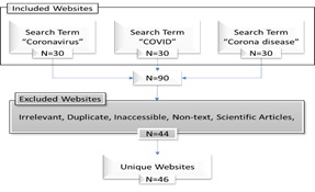 To conduct this study, the terms “covid”, “coronavirus”, and “corona disease” were searched in Persian using Google search engine [26,27]. Because most users use the first three pages of search results [28], the first three pages of Google search results were retrieved. The search was performed on October 20, 2023, using the Google Chrome web browser. Before the search, the browser was set to private mode, and all browsing history and cookies were cleared; the first 30 results from Google search engine were selected for analysis. All URLs were evaluated, and irrelevant, inaccessible, non-Persian, duplicate, advertising, and non-textual sites (containg fewer than 100 words) were exluded. Finally, 46 websites containing information about Corona disease were selected as samples for this study (Figure 1).