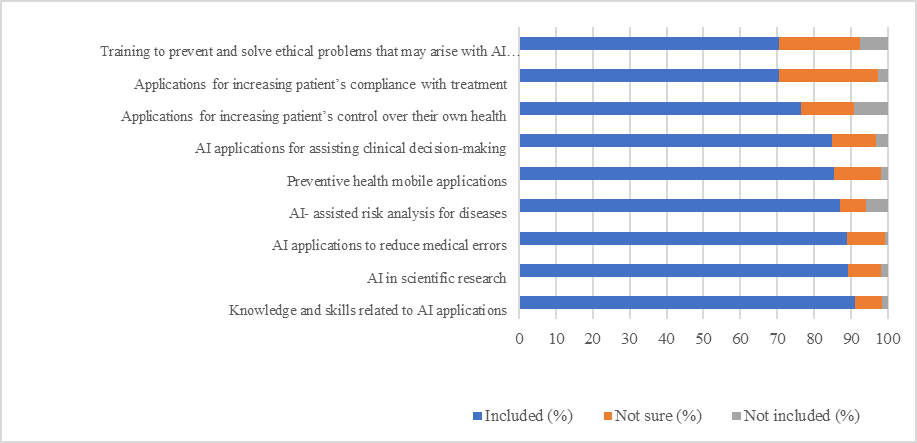 Students' educational needs regarding AI: Knowledge and skills related to artificial intelligence applications received the highest priority among participating students (91.2%). AI in scientific research (89.2%) and AI applications for reducing medical errors (88.8%) were the next highest priorities for students. Figure 1 shows the topics with that more than 70% agreement among students.