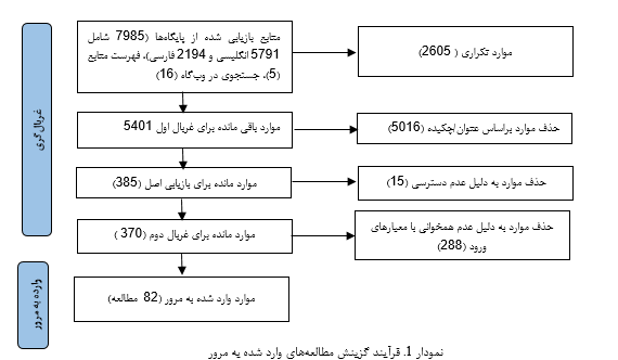 انتخاب منابع: جستجوی منابع منجر به شناسایی 7985 مطالعه از جستجو در پایگاهها، پنج مطالعه از بررسی فهرست منابع و 16 مستند از جستجو در وبگاههای سازمانی شد که پس از حذف 2605 مورد تکراری، تعداد 5401 مطالعه وارد مرحله اول گزینش و غربالگری شدند. در مرحله غربالگری براساس عنوان/چکیده 5016 مطالعه حذف شد و اصل مطالعههای باقیمانده (385) بازیابی شد. 15 مطالعه به دلیل عدم دسترسی به اصل مقاله حذف شدند و 370 مطالعه جهت غربالگری اصل مقاله انتخاب شدند. در پایان این مرحله پس از حذف 288 مقالات نامرتبط بر اساس متن، 82 مطالعه نهایی جهت استخراج داده وارد مرور شد (نمودار 1).