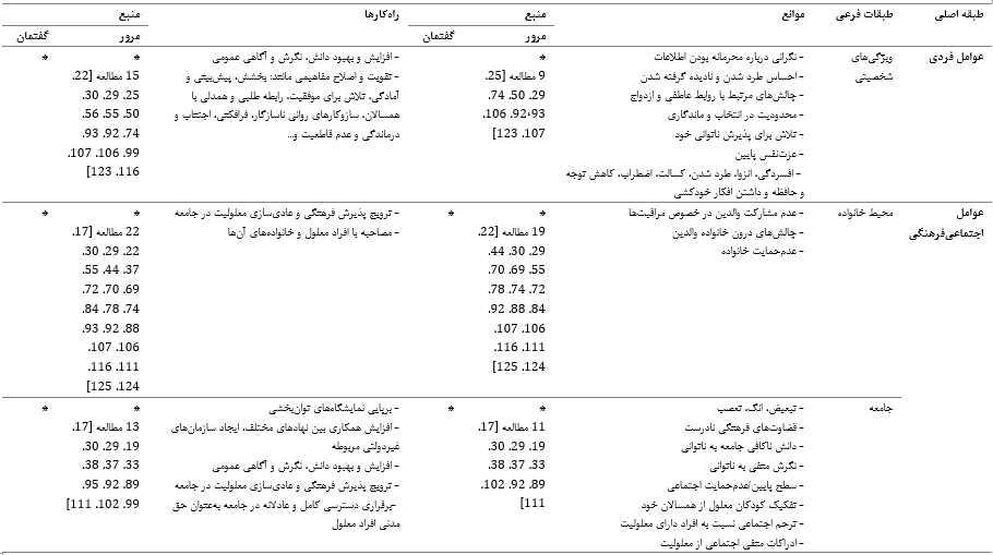 موانع و راهکارهای دسترسی افراد دارای معلولیت به خدمات: یافتههای مرور و جلسه ذینقشان منجر به شناسایی 21 مانع در دسترسی افراد دارای معلولیت به خدمات و 19 راهکار پیشنهادی شد که در هفت طبقه شامل موانع فردی، اجتماعیفرهنگی، اطلاعاتیارتباطی، اقتصادی، مدیریتیسازمانی، فیزیکی محیطی و سیاستیقانونی طبقهبندی شدند (جدول 2).