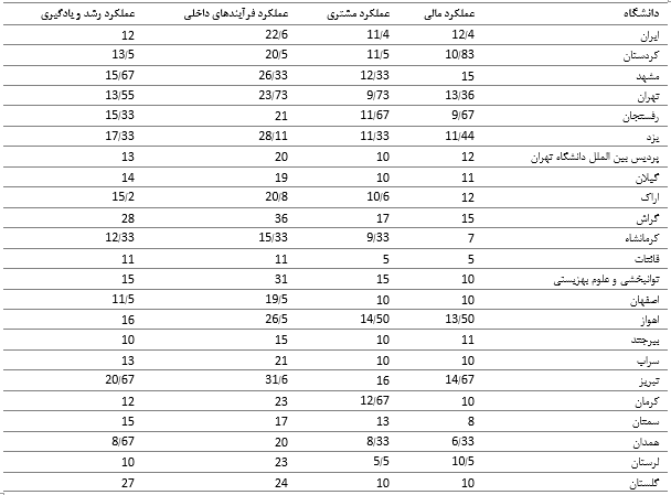 عملکرد کتابخانه‌ها و مراکز اطلاع‌رسانی مرکزی دانشگاه‌های علوم پزشکی ایران بر اساس مدل کارت امتیازی متوازن و به تفکیک ابعاد چهارگانه ارزیابی شد. میانگین عملکرد مالی 3/96±11، میانگین عملکرد مشتری 3/58±10/56، میانگین عملکرد فرآیندهای داخلی 7/28±22/13و میانگین عملکرد رشد و یادگیری 4/82±13/93 بود. در زمینه "عملکرد مالی" دانشگاه علوم پزشکی هرمزگان با میانگین نمرات عملکرد 17؛ و در زمینه "خدمات مشتری"، "فرآیندهای داخلی" و "یادگیری و رشد"، دانشگاه علوم پزشکی فارس به‌ترتیب با میانگینهای نمرات عملکرد 17، 36 و 28 در صدر قرار گرفتند. کمترین امتیاز کسب شده در میانگین امتیازهای "عملکرد مالی"، "خدمات مشتری" و "فرآیندهای داخلی" مربوط به دانشگاه علوم پزشکی خراسان به‌ترتیب با امتیازهای 5، 5 و 11 بود. دانشگاه علوم پزشکی همدان نیز با میانگین امتیاز 67/8 حائز کمترین میانگین امتیاز کسب شده در "عملکرد رشد و یادگیری" بود (جدول 2).