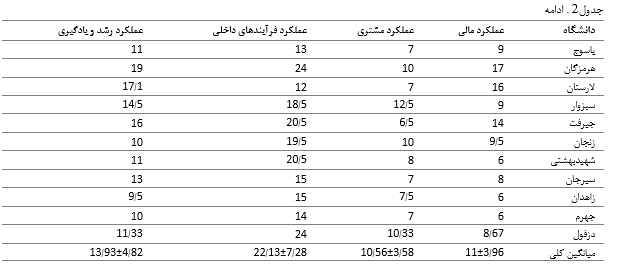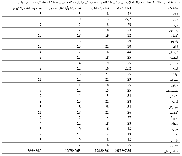 جدول2 . میانگین امتیاز عملکرد کتابخانه‌ها و مراکز اطلاع‌رسانی مرکزی دانشگاه‌های علوم پزشکی ایران از دیدگاه کارکنان و به تفکیک ابعاد کارت امتیازی متوازن
