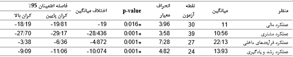 برای مقایسه نظر مدیران و کارکنان از آزمون تی مستقل استفاده شد. نتایج نشان داد که تفاوت معنی‌داری بین مدیران و کارکنان از هر چهار منظر وجود دارد. میانگین نمره مدیران از دو منظر عملکرد مالی و مشتری از میانگین نمره کارکنان بیشتر بود ولی در  دو منظر عملکرد فرآیندهای داخلی و عملکرد رشد و یادگیری، میانگین نمره کارکنان بیشتر از مدیران بود که این تفاوت‌ها از نظر آماری معنی‌دار بود (جدول 2 پیوست).