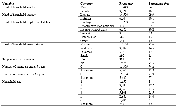 In this study, 20,764 households covered by the Iran Health Insurance Organization were analyzed. The demographic characteristics of the insured households are presented in Table 1.