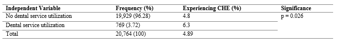 The results showed that 3.7% of the study population had utilized dental services in 2019, while approximately 96% had not utilized such services. The incidence of CHE was higher among households that utilized dental services compared to those that did not, indicating that dental care use increases the likelihood of experiencing CHE, with the incidence rising from 4.8% to 6.3% (Table 2).
